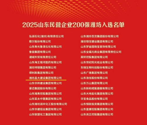 會(huì)上,昌大建設(shè)集團(tuán)憑借穩(wěn)健的發(fā)展、突出的行業(yè)貢獻(xiàn)及良好的社會(huì)口碑,不僅入選2025濰坊市50強(qiáng)企業(yè)名單,還連續(xù)榮獲2025山東民營企業(yè)200強(qiáng)等多項(xiàng)省級榮譽(yù)。同時(shí)集團(tuán)所屬泰和置業(yè)有限公司還獲得2025山東民營企業(yè)服務(wù)業(yè)100強(qiáng)等省級榮譽(yù),充分彰顯了集團(tuán)作為濰坊建筑業(yè)領(lǐng)軍企業(yè)的實(shí)力、地位和作用。